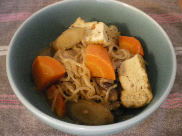 豚肉・・・80g 紅蘿蔔・・・1條 牛蒡・・・1/2條 洋葱・・・1/2個 細切的蒟蒻・・・200g 豆腐乾・・・2個