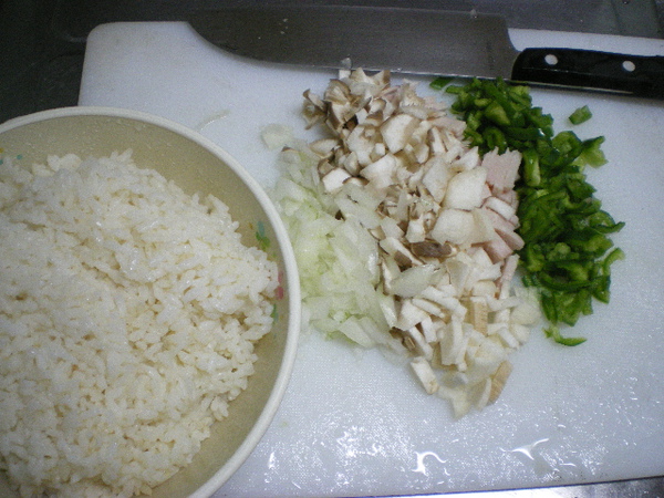 飯・・・2人分 火腿・・・2片 青椒・・・1個 洋葱・・・1/4個 香菇・・・4個