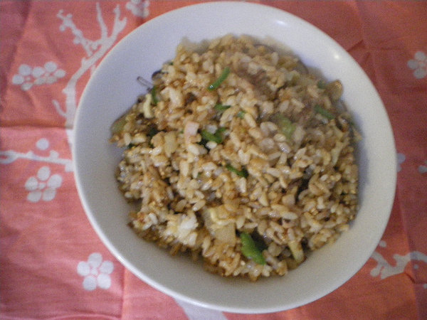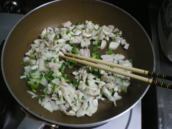油入鍋、放在細切的火腿・青椒・洋葱・香菇用大火炒、加飯継続炒。加醤油・干制鰹魚、醤油爆香、最後加胡麻。