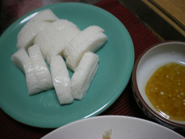 蒲鉾沾醤油和山葵(WASABI)。 很好吃~