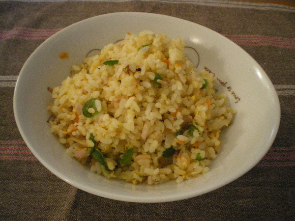 油入鍋、放在細切的紅蘿蔔・火腿・青椒・洋葱・用大火炒、加飯継続炒。加鶏蛋炒、最後加鹽和胡椒,就完成了