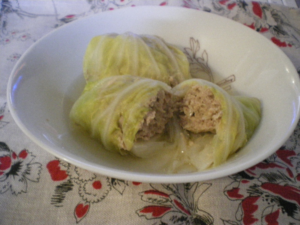 先用鍋開水、放入高麗菜的葉子到柔。A攪拌。用高麗菜的葉子包A。用鍋再開水(少量)、加入魔厨高湯和月桂樹的葉子攪拌。