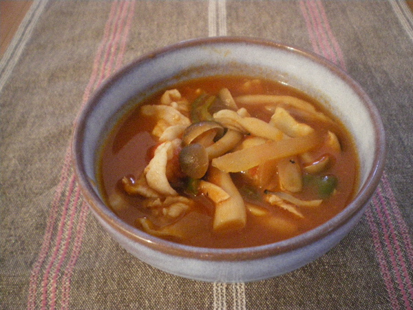 用鍋油、先放入細切的大蒜爆炒一下。再加入細切的洋葱炒至酥黄。以後放入細切的香菇和青椒炒、加番茄煮一下。