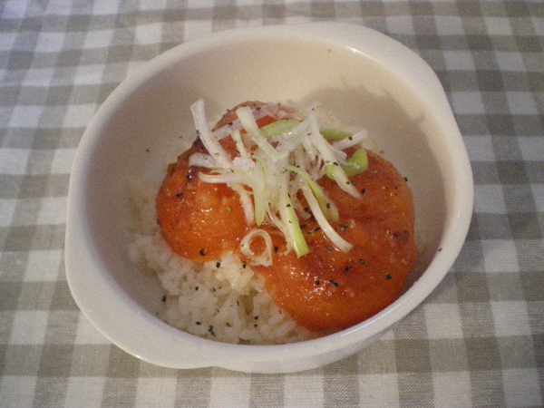 先鍋用橄欖油熱、放入番茄。用弱火、烤5~10分。上飯放烤的番茄、加入塩・胡椒・橄欖油。就完成了